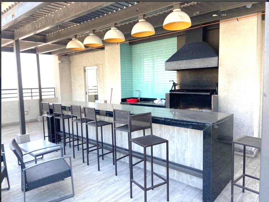 Arriendo hermoso, comodo e iluminado departamento estudio de un ambiente amoblado con cama de dos plazas, mesa, 2 pisos, lavadora, refrigerador, cocina amoblada y equipada con cocina, horno, campana, ademas cuenta con gran termo de agua caliente, baño completo, amplio closet, ventanal de muro a muro, con orientacion poniente, en piso 9, sin estacionamiento ni bodega. El condominio cuenta con estacionamiento de visitas y espectacular quincho en azotea panoramica. El edificio se encuentra ubicado en Avenida San Pablo, frente a estacion metro Gruta de Lourdes en Quinta Normal.